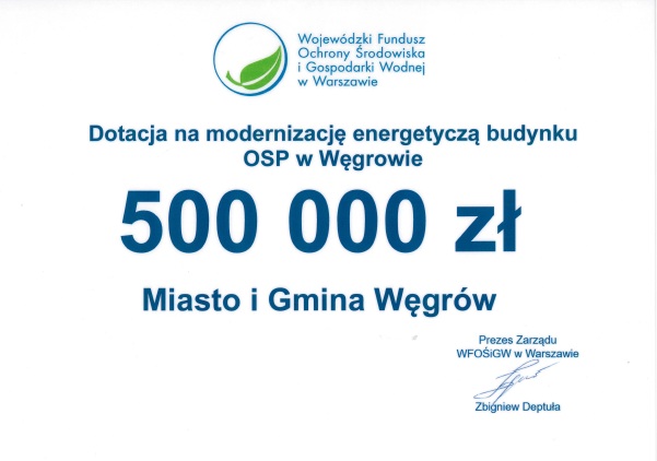 Miasto Węgrów otrzymało dotację z Wojewódzkiego Funduszu Ochrony Środowiska i Gospodarki Wodnej w wysokości 500 000 zł na modernizację energetyczną budynku Ochotniczej Straży Pożarnej w Węgrowie. Umowę dotacji 6.11.2025r. podpisał Prezes WFOŚiGW Pan Zbigniew Deptuła, ze strony Miasta Węgrowa Pan Burmistrz Paweł Marchela, przy kontrasygnacie skarbnika Miasta Pani Agnieszki Kądzieli – Biernat. Elementy składowe modernizacji budynku OSP to: wymiana stolarki okiennej, docieplenie ścian zewnętrznych i cokołu budynku, docieplenie dachu, modernizacja instalacji CO, instalacja powietrznej pompy ciepła, magazyn energii, instalacja wentylacji mechanicznej. Spodziewany efekt ekologiczny przedsięwzięcia to: zaoszczędzona energia elektryczna i energia cieplna, redukcja emisji gazów cieplarnianych.