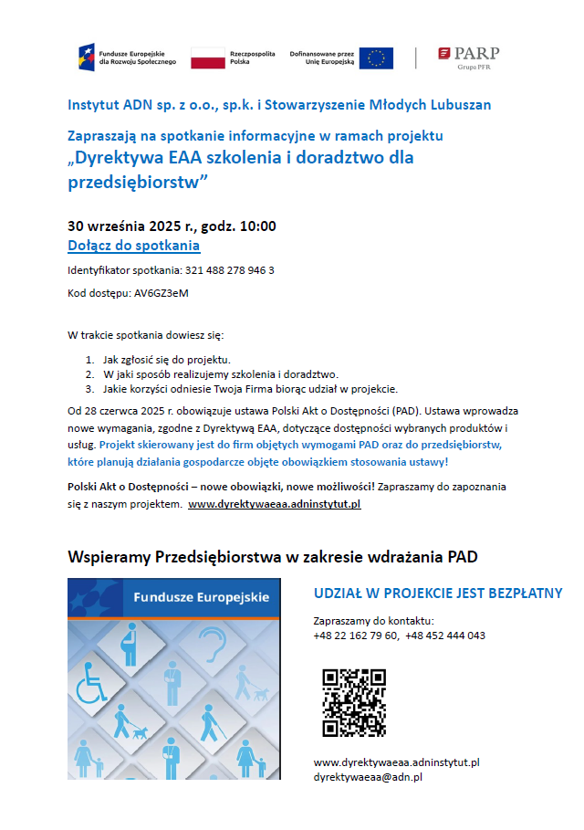 Beata GontarzAutor, Beata Gontarz 156Ilość wyświetleń, 156Link do spotkania w dniu 30.09.2025 r.: Identyfikator spotkania: 321 488 278 946 3, Kod dostępu: AV6GZ3eM Szczegółowe informacje o projekcie dostępne są na stronie: www.dyrektywaeaa.adninstytut.pl Więcej informacji w załączniku. |